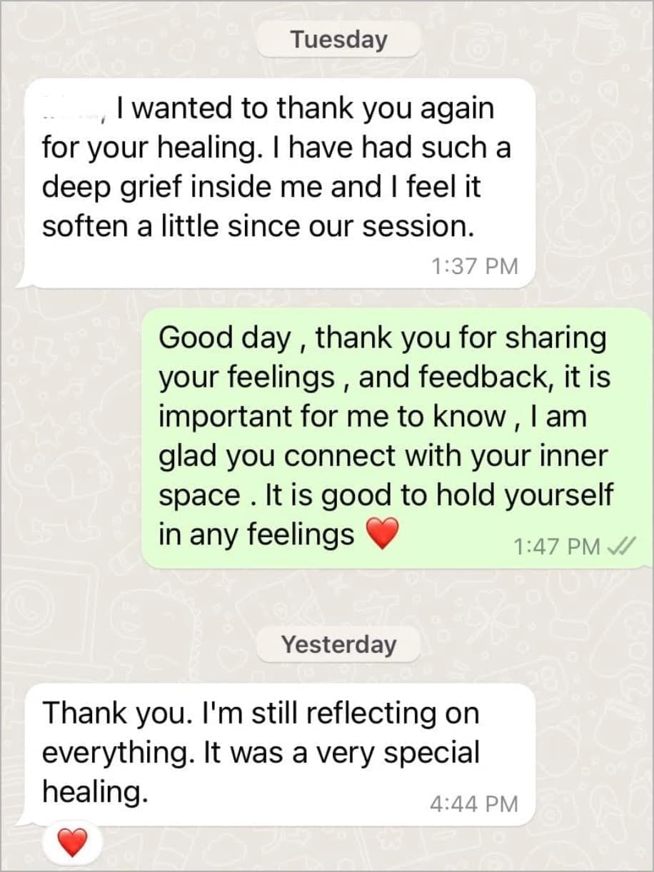 My sessions can give nourishment and deep relaxation , and every time deep connection to your body and energy brings healing to your body .